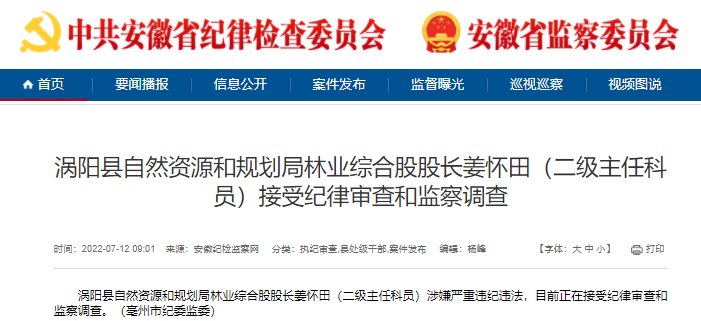 新安晚报 安徽网 大皖新闻讯 据安徽纪检监察网消息 涡阳县自然资源和规划局林业综合股股长姜怀田(二级主任科员)涉嫌严重违纪违法,目前正在接受纪律审查和监察调查。(亳州市纪委监委)