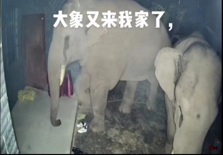 监控视频记录,万籁俱静的黑夜被接连不断的犬吠声打破,过了一会,一只大象从黑暗中缓缓走来,停在了屋子前。不一会儿,另一头大象也慢慢跟来,两头象在门口东张西望,似乎是在找吃的。驻足停留了近4分钟,才转身离开。